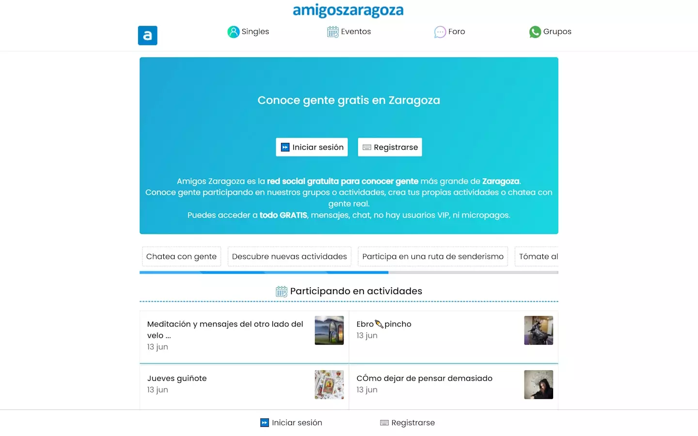 Todas las funciones de AmigosZaragoza.es están disponibles sin ningún coste y serán fácilmente reconocibles para casi todos los usuarios: Chat: A través del chat podemos mantener conversaciones privadas con otros usuarios, que podremos releer más tarde. Cualquier persona puede ser bloqueada si lo deseamos. Notificaciones: En esta lista vemos todas las interacciones con nuestro perfil. Likes, visitas, notificaciones del sistema, etc. Actividades: Calendario con todas las actividades y eventos propuestos por los usuarios. Foro: Conversaciones públicas sobre todo tipo de temas.