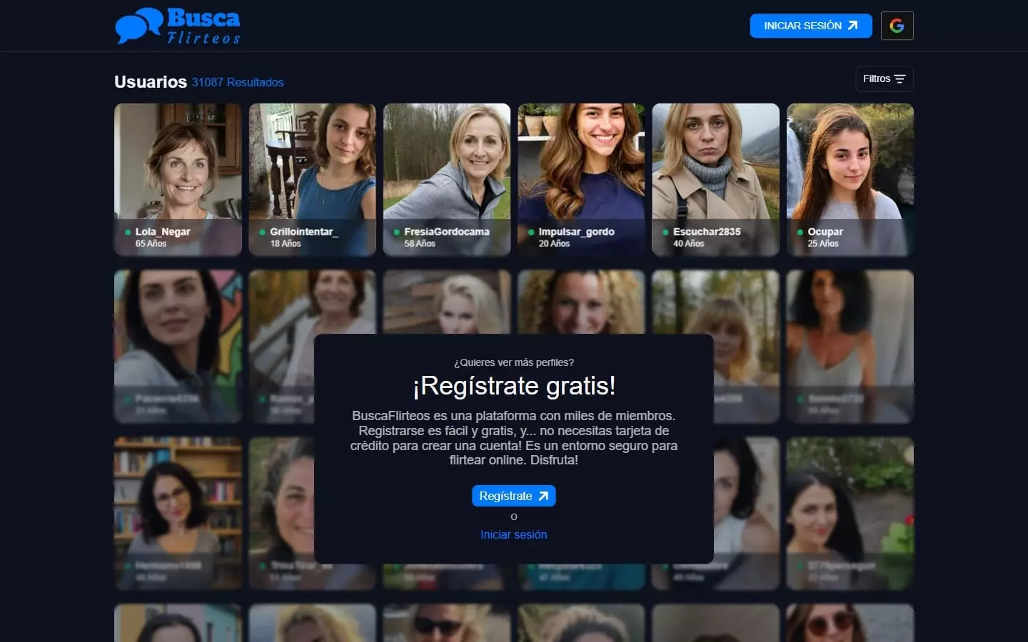 Solo toma un minuto darse de alta en BuscaFlirteos.com. Se puede proporcionar una dirección de email o bien una cuenta de Google. Tendremos que hacer clic en un correo de confirmación y aceptar los términos y condiciones. De nuevo, se nos advierte discretamente del uso de perfiles falsos en letra pequeña. No se requiere ningún documento que confirme nuestra mayoría de edad. Sin embargo, las imágenes se vuelven de inmediato bastante más explícitas que en la página de inicio.