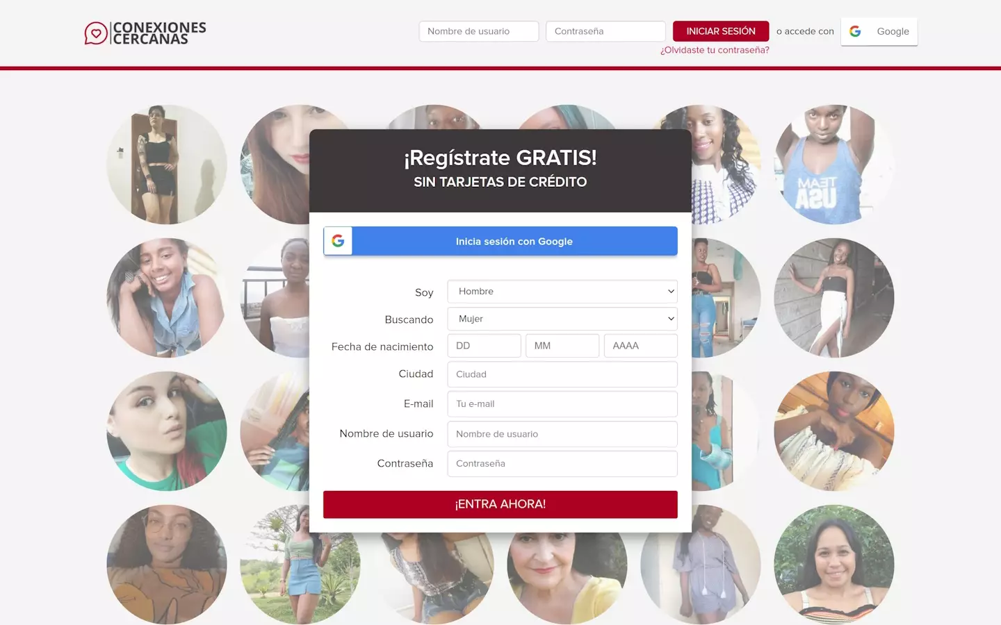 ConexionesCercanas.com tiene la misma estructura que muchas otras webs de Axton International BV. Se ven unas cuantas fotos de perfil de fondo con formato circular. Muchas de las mujeres son negras o latinas. Superpuesto a las imágenes aparece un formulario para darse de alta. En un pequeño texto al pie de página se admite el uso de perfiles falsos, y se informa del rango de precios por mensaje. Dicen aprovechar el hecho de que hoy en día Internet hace la tarea de ligar más fácil que nunca.