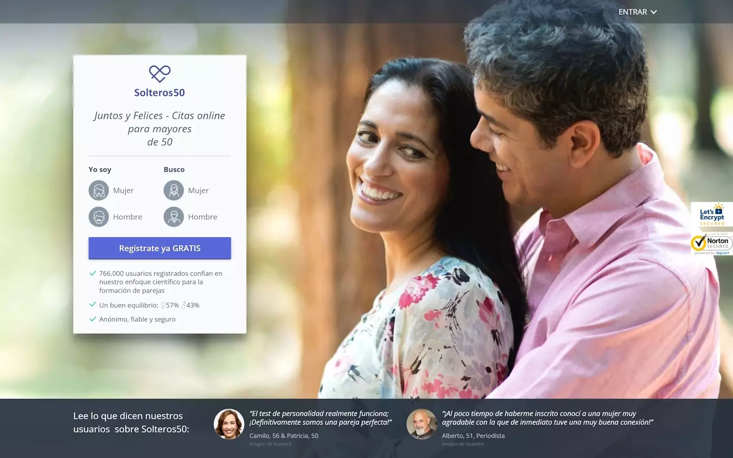 Solteros50 es una agencia de citas en línea especializada en el amor maduro. Es posible registrarse a partir de los 40 años, aunque la mayoría de usuarios tiene de 50 para arriba. Solamente está orientado a relaciones heterosexuales. De hecho, hay una excelente distribución de los sexos de casi una mujer por cada hombre. Esto es muy poco habitual en el sector de las citas en línea.